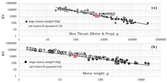 which is represented by the line in Figure 6b that is well correlated by the data. Note that higher motors will create higher angular velocity while lower motors will generate higher torque for a given voltage. Hence, larger propellers are paired with low motors, while smaller and lighter propellers are paired with high KV motors.