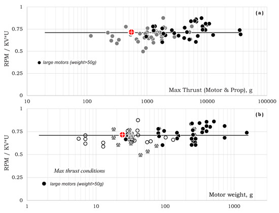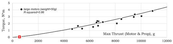 As shown in Figure 11, the relation between the actual RPM and the RPM without loading (i.e., ) for all motors is around 0.71. For large motors, the relation is around 0.74. No dependency in max-thrust and/or motor weight was found (note that thrust and weight are linearly related—see Equation (7)).