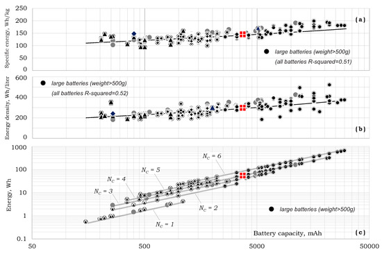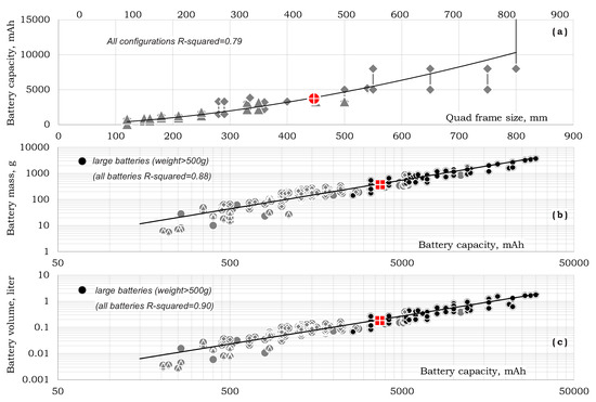 Battery mass and volume as functions of battery capacity are presented in Figure 12b,c as the following relations: