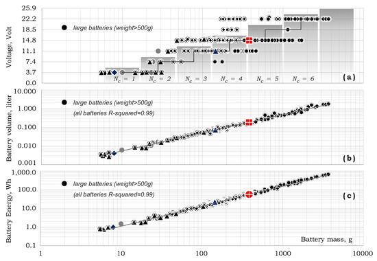 Battery voltage (essentially Volt where is the number of 3.7 Volt cells), volume and energy are well correlated with battery mass as shown in Figure 13. Figure 13a shows rough relation between the number of cells and battery mass that may be approximated as: