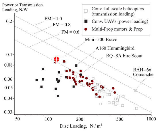 This section demonstrates some examples of statistical trends of sub-systems of multi-prop UAVs that were collected from the open literature, for example, Refs. [15,16,17,18,19,20,21,22,23,24,25,26,27]. Part of these trends will be accompanied by the characteristics that were determined by RAPiD (Rotorcraft Analysis for Preliminary Design)—see Refs. [28,29,30,31]) using the numerical process described further on in this paper. One example is demonstrated throughout this paper where symbols of a cross-over-a-circle are RAPiD’s calculated results and symbols of a-cross-over-a-square indicate values that were taken from the design trend lines to facilitate the analysis.