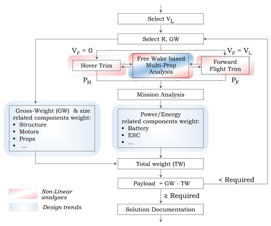 Once the power required for both hover and loiter phases and the total energy are known, the weight of all components that depend on , and (e.g., battery weight) are evaluated by the relevant design trends as described in this paper. Parallel to that, the weight of all components that depend on R and (e.g., structural weight) are also evaluated by the above design trends. At this stage, the total vehicle weight (apart from the payload), , may be determined as the sum of all of the above components. This value is used to calculate the remaining weight that may be dedicated to the payload (i.e., ). Once that payload satisfies the required one, the design is completed and valid. Note that the search is initiated by a set of () that consists of relatively small propeller radius and gross-weight values. This set is gradually growing as the search process develops.