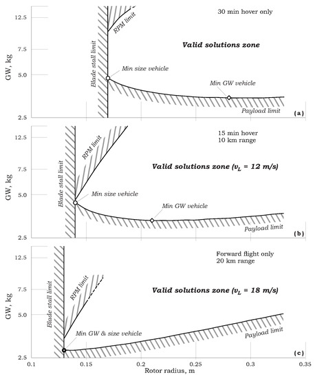 Figure 20 shows typical results of the above-described scheme for the extraction of the vehicle of minimum weight and minimum size for three different missions. Solution zones are confined within the following boundaries: Blade stall limit, RPM limit, and Payload limit. Each point inside these limits represents a valid solution (i.e., a solution that accomplishes the mission with a reserve payload/range/battery/thrust & power levels). The two solutions (the vehicle of minimum weight and the vehicle of minimum size) are clearly marked on the Payload limit. Other points are solutions where heavier or larger vehicles were obtained. For example, as shown in Figure 20b, for an assumed loiter velocity of 12 m/s, a vehicle of = 3.3 kg is the lightest one (accompanied by propeller radius R = 0.21 m) and a vehicle with a propeller of radius of R = 0.14 m (accompanied by = 4.4 kg) is the smallest one.