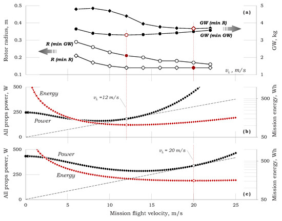 (a) Propellers radii and gross-weights; (b,c) Power and energy for the “minimum GW vehicle” and the “minimum R vehicle”. All variables are plotted vs. forward flight velocity.