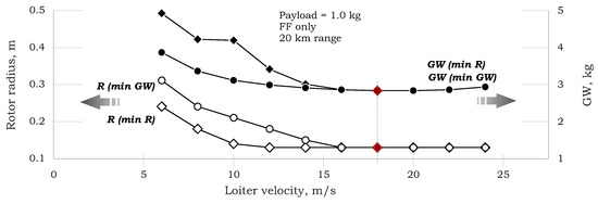 Figure 22 is drawn for a mission of forward flight for a range of 20 km only. As shown for a high enough velocity, both “minimum weight” and “minimum radius” collide (R = 0.13 m, = 2.825 kg)—see also Figure 20c.