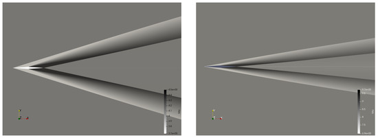 Here is the diameter of , and is the polynomial degree of approximation. The parameters and can be used to tune the shock-capturing term. In the present work, we set . The term (20) can be added to the semilinear form (17) to provide nonlinear stabilization. This approach is somewhat generic in the sense that it is not especially tuned to the physical model under consideration. It has proven successful for transonic and supersonic external aerodynamics. Below we show that the range of application extends to moderately hypersonic flow conditions, not exceeding . For higher Mach numbers more carefully tuned shock capturing may become necessary [30].