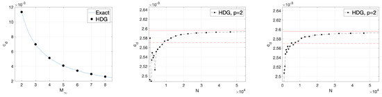 Diamond Airfoil, computation of drag coefficient. (Left): Comparison with exact values, perfect gas model. Solution on adapted grids with ca. elements. (Middle/Right): perfect gas/high-enthalpy frozen flow model. Convergence, using -based Mesh optimization. The solid red line is the reference value. The dashed red line indicates values within 1% of the reference value.