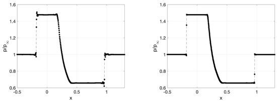 Diamond airfoil (), perfect gas model. Line plot of non-dimensional pressure at . (Left): No shock capturing. (Right): Shock capturing using Equation (20).