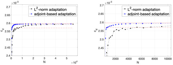 Diamond Airfoil, drag convergence. (High-temperature model, , ). The right figure shows a magnified view. The solid red line is the reference value. The dashed red line indicates values within 1% of the reference value.