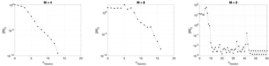 Equation (16) is solved using a Newton–Raphson method. Writing , the linearized global system is given in block-matrix form as