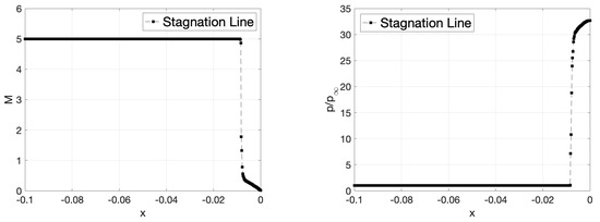 Shock are again resolved only as far as necessary for the computation of the drag coefficient. For free stream conditions , Figure 17 shows a plot of Mach number and pressure along the stagnation line, using the solution obtained from the high-enthalpy frozen flow model (Model 2 in Table 1). It is clearly visible that the shock is well-captured.