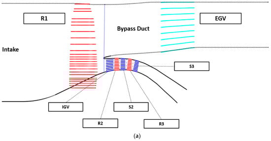 (a) Meridional view of the research engine components modelled, (b) computational domain, and (c) blading of IGV and first two booster stages.