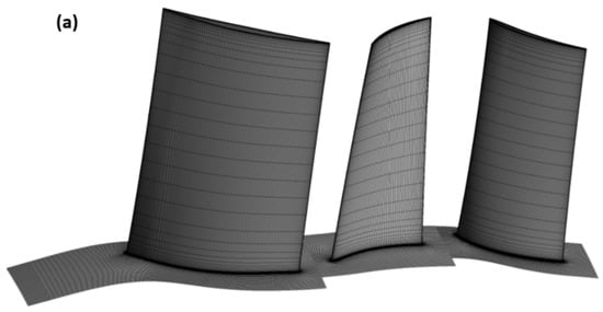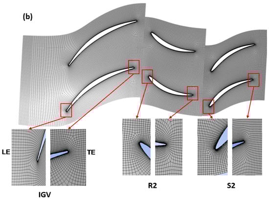 A structured mesh was generated using the Turbogrid meshing tool, CFD, CFX 19.1V (ANSYS Inc, Canonsburg, PA, USA), which is part of the CFD, CFX 19.1V (ANSYS Inc, Canonsburg, Pa, USA) suite. The mesh sensitivity was carried out on all of the computational domains. An example of the surface mesh on the hub, and details of the LE and TE at 50% blade height are shown in Figure 2 for the IGV, R2, and S2 blade rows.
