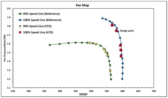 The CFD and Turbomatch results were examined against the NASA E3 reference data [27,28,29]. Furthermore, the CFD results were compared against the design parameters of the available fan rotor data of the E3 engine [29]. The outcomes are verified in terms of the PR and the NDMF. The results obtained from the CFD simulations at both 90% and 100% speed-lines presented a very good match with the reference data, as shown in Figure 4. Additionally, it was found that the maximum deviation of the CFD results compared to the design objective was 1.9% of NDMF at the 100% speed-line.