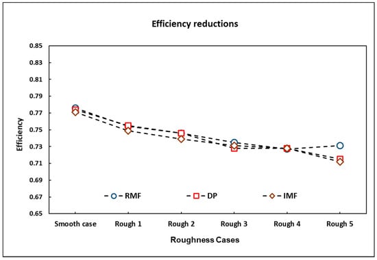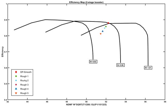 In comparison, the maximum reduction in the efficiency of 7.7% was found at the operating point corresponding to IMF. A very similar result was obtained for the compressor efficiency at the DP as shown in Figure 7.