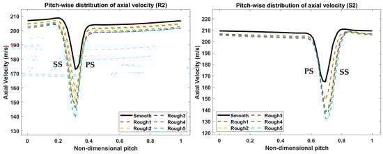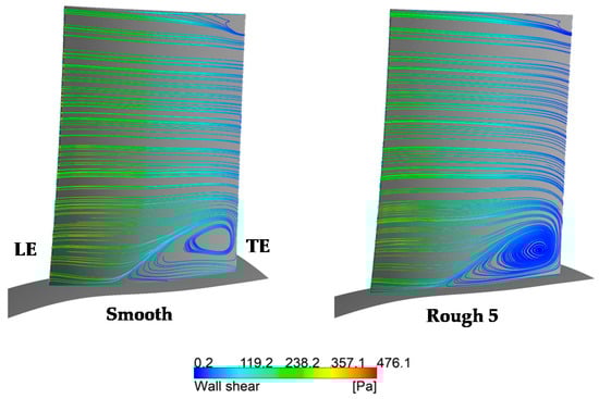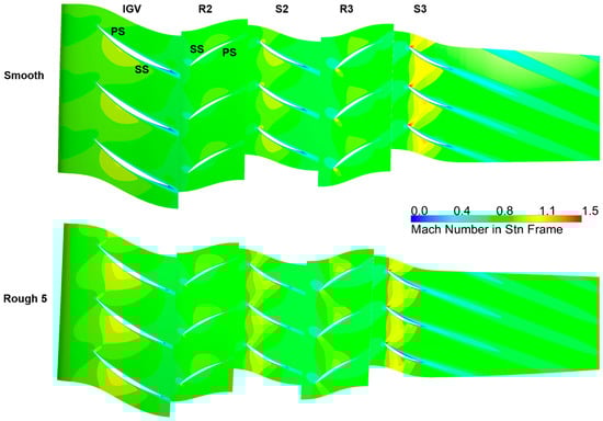 Increasing the blade’s surface roughness has a noticeable effect on the flow field, especially across the blade SS of the stators and rotors. In order to demonstrate the impact of surface roughness on the LPC components, the IGV is selected.
