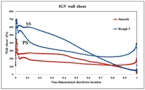 The wall shear stress on the SS of the IGV is plotted in Figure 8 below for the smooth and the Rough 5 cases. As is apparent, there is some inward radial migration near the end walls with the occurrence of a sizable hub corner stall, which starts at the midchord position for both roughness cases.