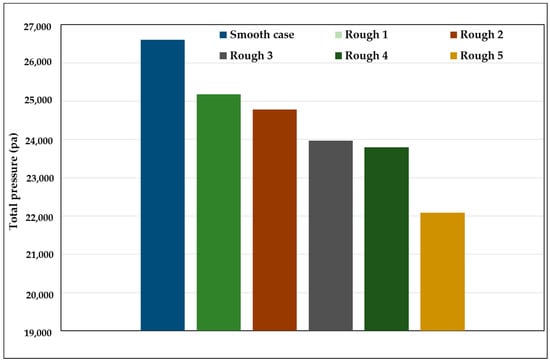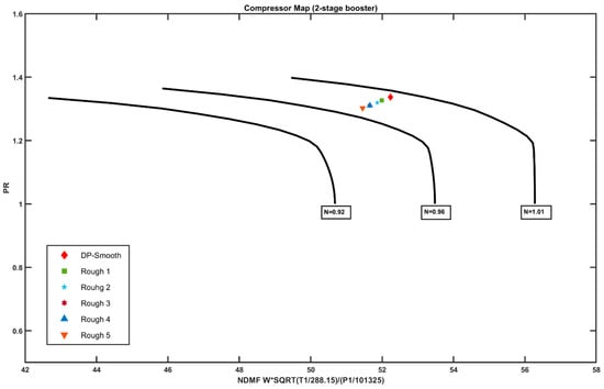 The increase in losses in the flow can result in a significant drop in the LPC’s PR and efficiency, reducing, therefore, the power output of the GTE. The numerical predictions of PR and efficiency reductions of the compressor at the 100% design speed, taken at the three different operating points are presented in Figure 6 and Figure 7, respectively. It can be observed that the values of the PR and the of the computed stages reduced progressively as the roughness conditions of the blades increased. The maximum reduction in PR of 3.1%, corresponds to the highest surface roughness at RMF condition as shown in Figure 6.