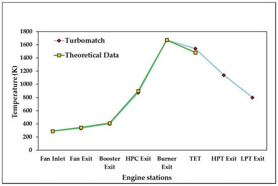 Furthermore, a comparison study was performed to compare the results of the numerical simulations of the modelled booster stages of the research engine at the design point. The results obtained that focus on the variation of the , PR, exit temperature (), and the of the second stage of the LPC are listed in Table 6. The outcomes demonstrate good agreement as the variation between the CFD results and the design calculation’s values are less than 4%.
