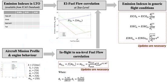 The fuel flow method (FFM2) [10] was proposed by the Boeing Company at the beginning of the 2000s to predict the emission indexes in a subsonic cruise condition, without the need to get access to any engine proprietary data. Instead of using proprietary data, the method exploits information publicly released after any successful engine certification process. This dataset (ICAO Engine Emission Databank [21]) includes emission indexes and fuel flows for the four main phases of the LTO (landing and take-off) cycle, which are evaluated for well specified reference conditions at prescribed thrust levels but all at sea level condition. The FFM2 has been a breakthrough innovation, allowing for the prediction of engine emissions when operating in cruise condition. Currently, the FFM2 has been adopted by several stakeholders as a precious tool not only for the evaluation of the emissions in cruise, but also for the estimation of the overall amount of pollutants emitted by a subsonic aircraft throughout an entire reference trajectory, as well as to support the generation of 3D emission inventories and the consequent evaluation of the impact of aviation on climate change.