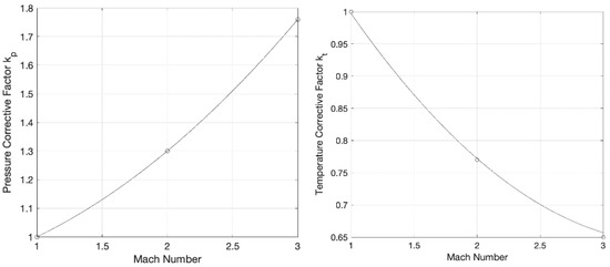 Pressure and temperature corrective factors as function of the Mach number.