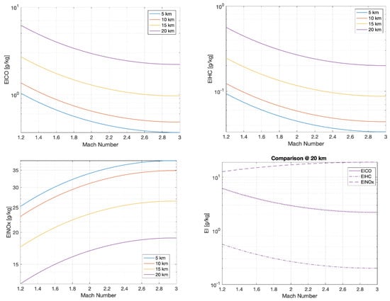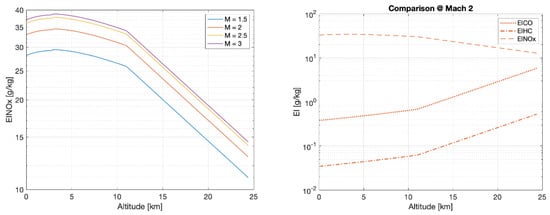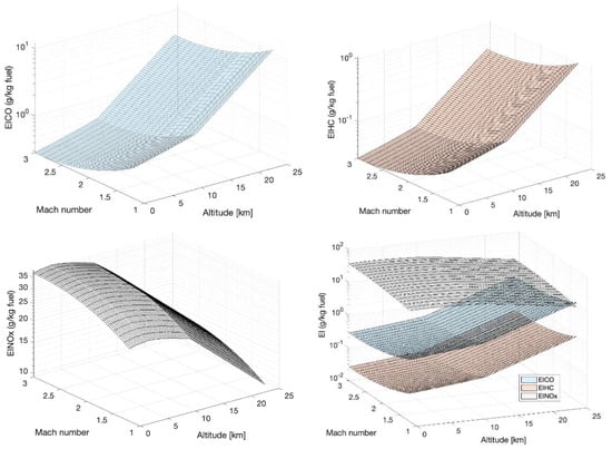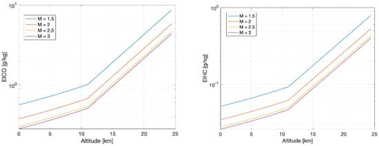 The first set of graphical results is reported in Figure 6, where for each specific cruise Mach number, it is possible to evaluate the impact of a variation of altitude onto the three emission indexes. It is possible to notice the trend discontinuity at 11 km of altitude due to the passage from the troposphere to the lower stratosphere (or tropopause): in this atmospheric layer, the temperature stops decreasing and the model assumes it is fixed at about −56 °C. This causes a change of behaviour of the quantities because the exponential trend of the pressure becomes overwhelming. In this case, the Mach number is fixed for each trend and used as a parameter. Figure 7 shows the results of the parametric analysis carried out to verify the impact of cruise Mach number on the emission indexes. When the Mach number is higher than 3, it seems that the trend changes direction, but this is not the case, probably due to the weakness of the model for the high supersonic regime. It is therefore wise to limit the application of the model in the Mach range between 1.2 and 3. Figure 8 shows 3D plots to complement the analysis and to provide the readers with an overall perspective on the problem.