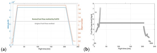 In addition, the EINOx value was compared to the data available from the in-flight test campaign, showing a better estimate with respect to the traditional method (see Table 5. It is important to notice that, in this case, using the same reference conditions as the original fuel flow method by Boeing, you cannot obtain meaningful EI values in cruise because the original fuel flow correlation is a reference fuel flow at sea level, which is much higher with respect to the fuel flow range reported in Figure 4.