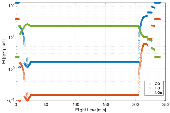 Starting from the available data reported in Table 5, the EI-fuel flow correlations have been graphically and mathematically identified, as shown in Figure 5.