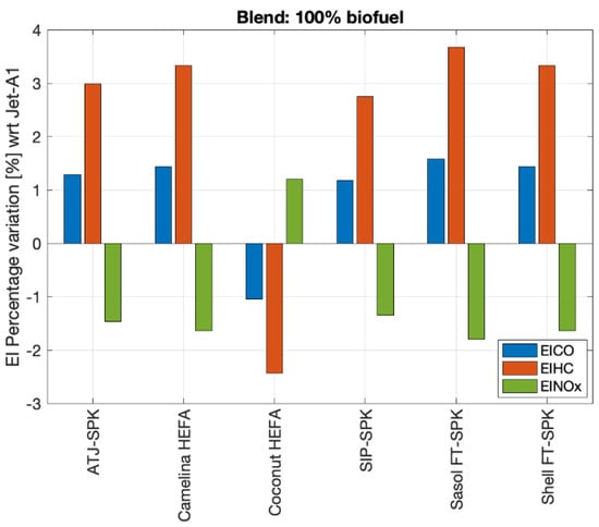 In addition, thanks to the modified model presented in this paper, it is possible to predict what might be the impact on these emission indexes of the exploitation of more sustainable fuels. Figure 11 reports in detail the theoretical maximum EI percentage variation due to the substitution of traditional fuel with a 100% biofuel. Positive variations represent an increment in emission indexes while negative variations are intended as beneficial for the environment. From this chart it is evident that it is not possible to minimise all emission indexes through the exploitation of a single biofuel type. A proper diversification in biofuels from different feedstocks and production processes may be highly beneficial and would increase the economic and the environmental sustainability of the entire product life cycle.