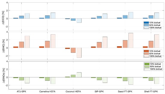Differences in emission indexes (g/kg) with respect to Jet-A1.
