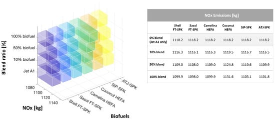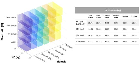 However, considering that biofuel blend ratios are currently bounded up to fix limits (as discussed in Section 2), the impact of a blend ratio from 10% to 100% is reported in Figure 12 for the three different species and for the six different biofuel families considered in this publication. Finally, Figure 13, Figure 14 and Figure 15 disclose the results of the entire mission simulation, providing graphical and numerical results of the impact of biofuel and blend ratios in terms of the overall amount of CO, HC, and NOx emitted by the Concorde at the end of its reference 4 h mission (Figure 9a).