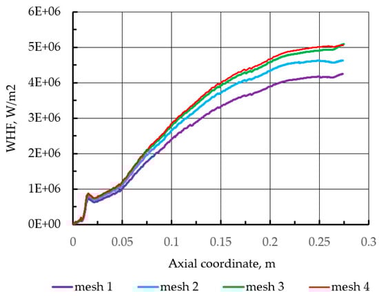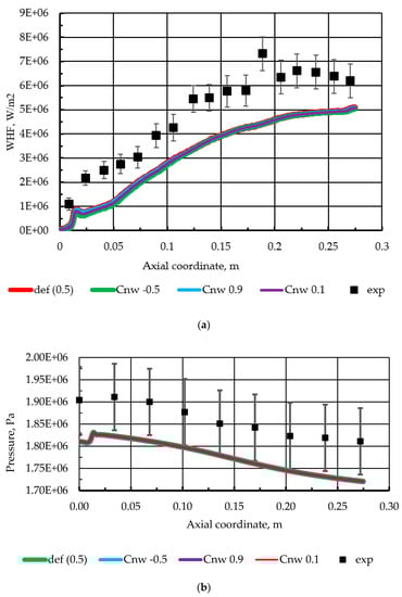The authors of the GEKO model do not provide a comprehensive description, namely, the mathematical description of its coefficients [37,38,39]. That is why the coefficients of the GEKO model are treated as empirical parameters in our work. According to [37], the coefficient of Cnw is designed to adjust the heat transfer predictions in the reattachment and stagnation regions and to eliminate their impact on the normal (flat plate) boundary layer. In the combustion chamber, we have a flow similar to a backward-facing step flow with heat transfer, and there is a corresponding stagnation point on the sidewall, which is visible on the wall heat flux profile. However, due to the fact that the length of the combustion chamber is one hundred times (305 mm/3 mm) larger than the distance from the injector to the side wall [27], the flow at this stagnation region has a negligible effect on the heat transfer in the chamber as a whole.