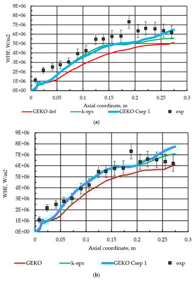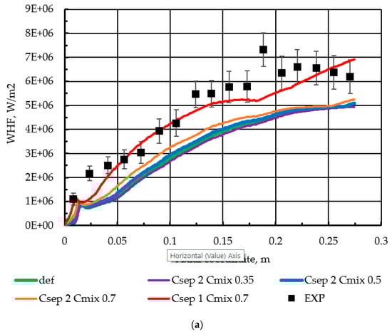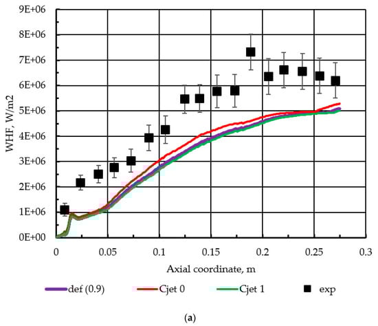 The influence of the kinetic model, at least for the studied mechanisms, is comparable to the influence of the ‘separation’ parameter adjustment of the GEKO model (or utilization of the standard k-epsilon model) rather than the default GEKO. The difference between the results for the Zhukov–Kong and RAMEC mechanisms, however, are addressed for different species fields and therefore different mixture properties. It has been shown that RAMEC, in general, results in higher wall heat fluxes, while the Zhukov–Kong mechanism provides better experimental pressure profiles. Due to higher estimated errors in the wall heat flux measurements, and also the absence of modeling of the radiative heat transfer, which can contribute to up to 10–15% of total wall heat flux depending on the wall properties and species concentrations [36,41,42,43,44], the Zhukov–Kong mechanism, which better agrees with the experimental pressures, can be recommended. Regarding the GEKO coefficients, Csep = 1 can be recommended as well as the standard k-epsilon model for further usage for the same applications, which may be beneficial for engineers in terms of convergence, having turbulence models built on a different basis (k-omega and k-epsilon) and demonstrating similar performances, and, in terms of GEKO, proving to be easily adaptable for the required application.
