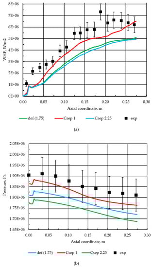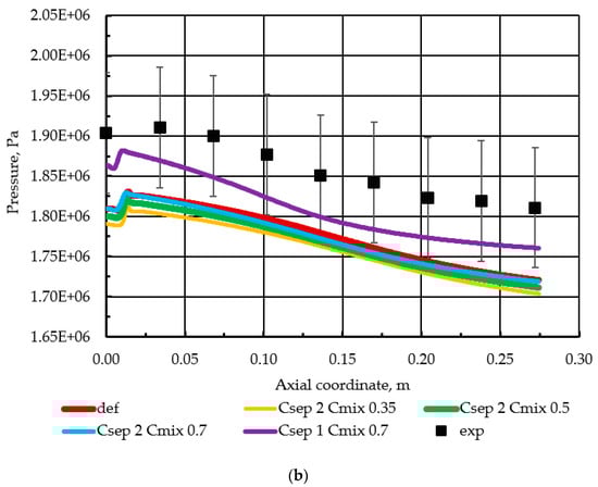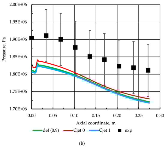 In this study, we found that the ‘near-wall’ and ‘jet’ parameters have a minor or negligible impact on the pressures and heat fluxes under the considered operating conditions. The largest effect is evident for Csep, i.e., by the ‘separation’ parameter, and a lesser effect is evident for the ‘mixing’ parameter, which is, however, strongly connected in its influence with the applied Csep parameter value, due to documentation [37]. The decreasing Csep leads to higher eddy viscosity values and, therefore, a higher mixing and combustion efficiency, resulting in pressure and wall heat flux rises. The pressure and heat flux profiles are given by the lowest studied values of Csep = 1, and present a similar behavior to the values provided by the conventional standard k-epsilon model.