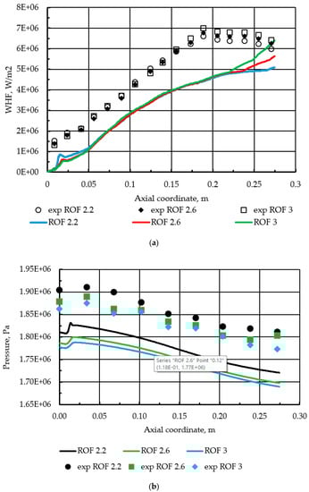 (a) Wall heat flux: experiment and simulations at different ROF (def = 2.2); (b) Pressure: experiment and simulations at different ROF (def = 2.2).