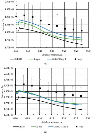 To improve the model performance in situations of adverse pressure gradients and the separation effects by predicting the logarithmic layer slope, both with the viscous-turbulent layer transition, the calibration of Csep (“separation” coefficient) is required. This coefficient is expected to primarily affect the flowfield when using the GEKO model and is central for any adjustments required, especially in the flows that are dominated by boundary layers. Although, in the present case, the nature of fluid flow effects is very complex, and the model behavior in the near-wall area might be important for the wall heat flux and, as a result, the general pressure level. The influence of Csep is presented in Figure 6. The strong effect of Csep is easily observed for both the heat flux and pressures, while the values of Csep = 2.25 and Csep = 1.75 (default) provide similar results for heat fluxes. It can be seen that smaller values of Csep provide higher pressures and wall heat fluxes, which is possibly due to higher eddy-viscosity levels provided by smaller Csep values, which is discussed. The qualitative difference for the heat flux and pressure profiles slope can be observed with Csep = 1, compared to other values of higher mixing due to higher eddy-viscosity levels result in higher levels of heat produced in the first half of the combustor, which further leads to a lowering of the pressure and heat flux profiles in the 3rd quartile of the combustor. Finally, the underburned fuel components remix, which results in the rise of the heat flux and pressure in the 4th quartile. This behavior is somewhat different from the default model settings and the experimental heat fluxes profile slope but reproduces the experimental profile slope to a more accurate degree. This behavior, nevertheless, is discussed later.