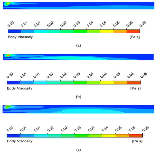 (a) Eddy viscosity field given by the default GEKO model; (b) Eddy viscosity field given by the standard k-epsilon model; (c) Eddy viscosity field given by the GEKO model with Csep = 1.
