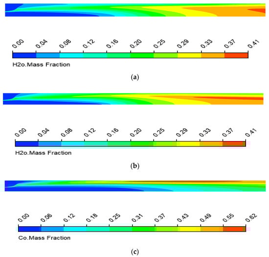 Another feature of the pressure and wall heat flux profiles presented in Figure 9 is the quantitative difference between the Zhukov–Kong and RAMEC mechanisms. The RAMEC mechanism generally displays a lower pressure by around 0.3 bar and higher heat fluxes by around 0.9 MW/m2, which is reasonable, as lower pressure values result from a lower energy left inside the combustor, while the differences for turbulence models are around 0.1–0.4 bar and 0.1–1 MW/m2 respectively. However, the higher heat fluxes might be due to different species fields, resulting in different thermophysical and transport mixture properties. The distributions of the prevailing reaction products (CO2, H2O, and CO) and temperature are presented in Figure 11 (all presented contours have been retrieved using the standard k-epsilon model).