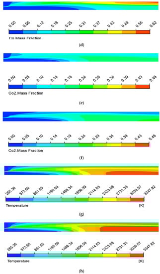 (a) H2O distributions given by the RAMEC mechanism, ½ axial scaling; (b) H2O distributions given by the Zhukov–Kong mechanism, ½ axial scaling; (c) CO distributions given by the RAMEC mechanism, ½ axial scaling; (d) CO distributions given by the Zhukov–Kong mechanism, ½ axial scaling; (e) CO2 distributions given by the RAMEC mechanism, ½ axial scaling; (f) CO2 distributions given by the Zhukov–Kong mechanism, ½ axial scaling; (g) Temperature distributions given by the RAMEC mechanism, ½ axial scaling; (h) Temperature distributions given by the Zhukov–Kong mechanism, ½ axial scaling.