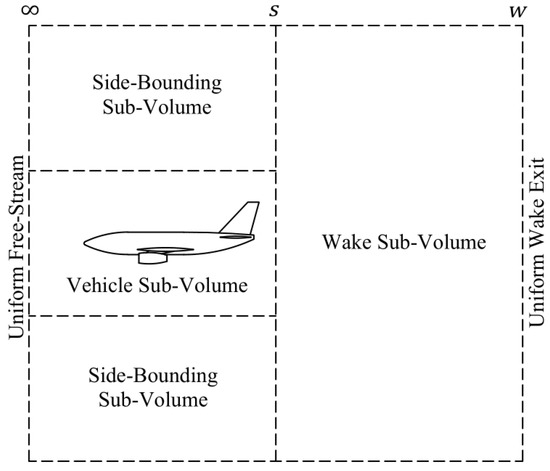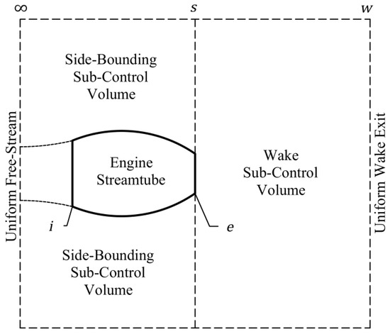 For analysis, the global control volume is divided into three sub-control volumes (see Figure 1). The first sub-control volume is that associated with the vehicle zone of influence (i.e., the flow field surrounding the vehicle and directly impacted or influenced by the vehicle, extending axially from to , and including the internal propulsion and propellant flow paths and all fluid in propellant feed systems and tankage). The second sub-control volume is that region defined by the side-bounding ‘far-field’ flow that is at freestream conditions (especially relevant for high-speed systems), theoretically extending to infinity in the lateral plane and extending axially from to . The third sub-control volume is that associated with the vehicle wake; it is downstream of the vehicle exit plane (extending from station to station ). The inflow to the global control volume at station is undisturbed and uniform at the freestream conditions. The outflow of the global control volume at is uniform (i.e., equilibrated) and the flow properties at are (for the very large lateral extent of the global control volume), by definition, infinitesimally displaced from those of the freestream.