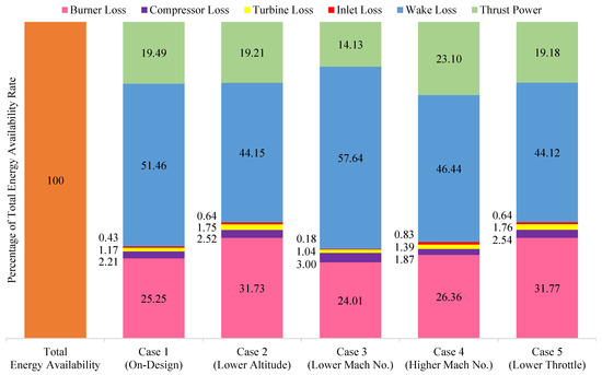 For all individual engine component losses as well as the overall engine loss rate, loss rates in energy availability as given in Figure 3 (and Table 3) are directly proportional to the mass flow rate of air inducted into the engine (determined by flight and operating condition and resulting spillage characteristics upstream of the inlet face), as well as the individual component loss characteristics. Inlet energy availability losses are due to shocks, friction, etc.; inlet losses scale with flight Mach number via the inlet (diffuser) total pressure recovery model used. Compressor and turbine losses are functions of compressor and turbine efficiency, respectively, at a given operating point (in turn dependent on the operating line developed by the component matching for off-design performance analysis). Figure 3 shows that for Case 1, inlet and turbomachinery together account for only around 5% of the total lost availability rate; the compressor loss is larger than the turbine loss while the inlet loss is very small, as expected at a flight Mach of 0.85. Although significantly smaller than the wake loss, the burner generates the largest engine component loss (accounting for approximately 31% of overall lost energy availability) in comparison with all other engine components. As a consequence of all losses, only about 20% of the total initial available energy rate for the on-design point is realized as thrust power. This fraction represents the instantaneous energy availability utilization effectiveness .