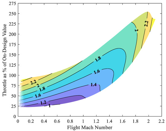 In order to be able to correctly predict the on and off-design performance of a specified engine, the coupling between integrated components (inlet, compressor, burner, turbine, and nozzle) must first be established, i.e., the individual components must be integrated (‘matched’) with each other. This drives the integrated-engine component operation lines on individual component performance maps. The information associated with this process then allows the correct prediction of the thrust, mass capture, and RPM across the off-design engine operational space of allowable flight Mach numbers, fuel throttle settings, and altitudes. The methodology of component matching and off-design performance evaluation is well-known and extensively documented in propulsion textbooks (see Refs. [35,36]). This section therefore provides only information relevant to specific modeling and component characterizations used in this particular work for the component matching for the defined turbojet engine.