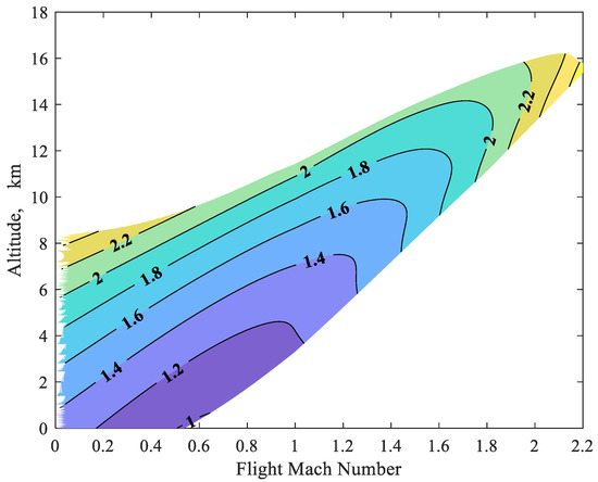 From Equation (18), is minimized at the flight condition (flight velocity and vehicle angle of attack) corresponding to flight for maximum endurance. The thrust specific fuel consumption, , for a specific engine is, strictly speaking, a function of flight Mach number, altitude, and fuel throttle setting. At a flight/engine operational point, it can be estimated from simple engine cycle analysis or found using the higher-level methodology of component matching and subsequent off-design performance analysis for an engine (as described and applied in this paper). However, it is generally assumed to be approximately constant in basic range and endurance analysis, i.e., when finding the flight velocity required for maximum range and endurance. With this assumption, when is differentiated with respect to flight velocity and set to zero (and also noting that for gas turbine engines in general), the well-known requirement for flight for maximum endurance is obtained that parasite drag must be exactly balanced by the induced drag, i.e., .