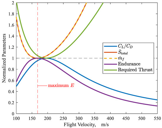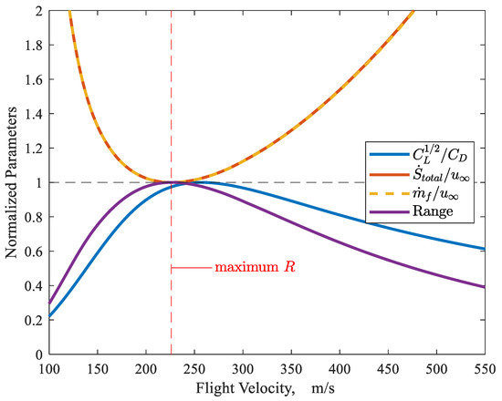 From Equation (19), this quantity must be minimized at the flight condition corresponding to maximum range. Furthermore, if this relationship is differentiated with respect to flight velocity and set to zero (again, ), the classic requirement for flight for maximum range is then obtained that the parasite drag is exactly three times the induced drag, i.e., . This analysis, along with the discussion in Section 6, therefore, provides the theoretical equivalence between the energy availability methodology (quantified in terms of entropy generation), classic range and endurance relationships, and flight conditions required to maximize range and endurance.