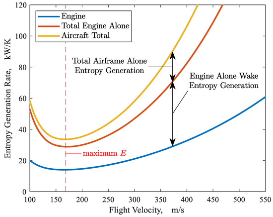 The total entropy generation rates on the right-hand side of Equation (20) are in turn composed of contributions occurring within the respective systems from to (again, evaluated at cruise flight conditions for the vehicle) and contributions occurring in the respective wake processes: