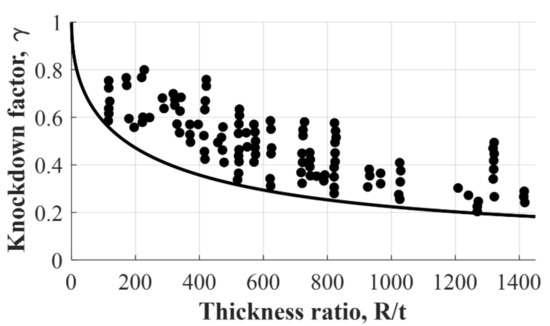 The initial imperfection of shell structures in buckling tests reduces the global buckling load, which is based on the linear buckling analysis of a perfect cylinder. Hence, the buckling knockdown factor is used to consider the reduction in the buckling load due to the initial imperfection. The buckling knockdown factor is defined as the ratio of global buckling loads with and without the initial imperfection of a shell structure, and it is used as the buckling design criterion for thin-walled shell structures. The lower the value of the buckling knockdown factor, the heavier is the thin-walled cylinder; therefore, the buckling knockdown factor is closely associated with the lightweight design of shell structures under axial compression. NASA established the lower bound of knockdown factors (Figure 1, [2]) based on experimental data from numerous buckling tests of cylinders conducted between the 1930s and 1960s. These knockdown factors are expressed in terms of the shell thickness ratio (radius-to-thickness ratio, R/t ratio) and have been used as the buckling design criterion for thin-walled cylinders of launch vehicles. However, when NASA’s knockdown factor [2] is used for modern space launch vehicles, the thin-walled cylinder may be designed unnecessarily conservative, i.e., over-weighted, because this buckling design criterion [2] cannot account for the high precision of advanced manufacturing technologies and modern composite materials for space launch vehicles in recent. Furthermore, this empirical knockdown factor [2] assumed that the effect of slenderness ratio (length-to-radius ratio, L/R ratio) was negligible on the buckling knockdown factor, although the slenderness ratio may have an influence on the buckling behavior of cylinders.