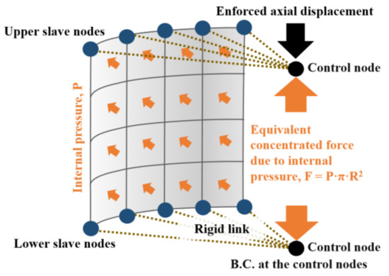 In this study, nonlinear post-buckling analyses are performed using the Newton-Raphson method along with the displacement control method in ABAQUS to analyze the buckling behavior of the composite cylinder under axial compression. The displacement control method uses the axial displacement instead of the axial compressive force. The enforced axial displacement is applied to the control nodes located at the center of the top and bottom surfaces of the cylinder. The control nodes are connected rigidly to the edge of the thin-walled composite cylinder (Figure 3); therefore, the applied displacement is transmitted to the edge of the cylinder with a uniform magnitude [26]. Furthermore, artificial damping of 5% is applied for numerical stabilization to dissipate the released strain energy using an artificial velocity for each node in the nonlinear static analysis when local instabilities occur [26,27,28,29,30]. The internal pressure on the curved side surfaces of a cylinder is represented by distributed pressure loads. The top and bottom surfaces of a propellant tank are usually designed in various shapes, such as spheres or ellipses; however, for simplicity, rigid circular plates are used for the top and bottom surfaces in this study. Thus, the internal pressure on the top and bottom surfaces of the thin-walled composite cylinder is modeled with the equivalent concentrated forces, which are represented as F = P·π·R2 and applied to the control nodes (Figure 3). The magnitude of the internal pressure is maintained while axial compression is applied to the cylinder for post-buckling analyses.