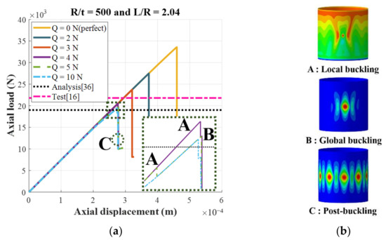 First, the modeling and analysis techniques are validated for the composite cylinder under axial compressive force only. For this validation, a Z07 thin-walled composite cylinder [16] is considered, as shown in Table 1. Figure 5 shows the results of the nonlinear post-buckling analyses for the Z07 thin-walled composite cylinder. As illustrated in Figure 5a, the (Ncr)perfect is predicted to be 33.57 kN. As Q increases, the global buckling load decreases and then converges. At a Q1 of 4N, local buckling (A) occurs. After the local buckling, (Ncr)imperfect (B) is converged to 19.66 kN. The global buckling load from the previous analysis using SPLA is 19.00 kN [36]. The difference of the (Ncr)imperfect between the present and previous [36] analyses is 3.47%. The measured global buckling load from the buckling test is reported as the value of 21.80 kN [16]. The relative error of the (Ncr)imperfect between the present analysis and buckling test [16] is 9.82%, and the error may have been caused by various uncertainties such as material properties, boundary conditions, and loading conditions in the buckling test. Therefore, based on the comparison between the present analysis and the previous prediction [36] and test [16], it is believed that the finite element modeling and post-buckling analysis methods for thin-walled composite cylinders under axial compression are validated appropriately. The buckling shapes at a Q1 are plotted in Figure 5b. In the figure, the local buckling (A) is caused by the Q, and the global buckling (B) waves spread in the circumferential direction at the side where the perturbation load is applied as the axial compressive load increases. After the global buckling, the buckling waves spread in the circumferential direction on the curved side surfaces of the cylinder, and post-buckling (C) is observed.