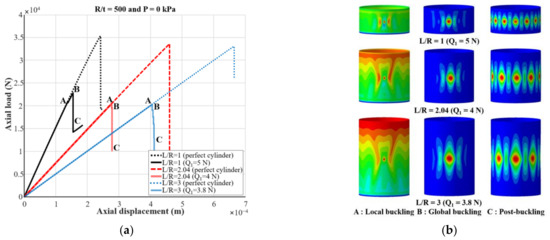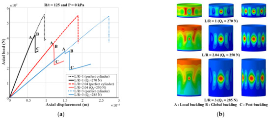 Using the present analysis methods, thin-walled composite cylinders with various shell thickness ratios (R/t = 125, 250, and 500) and slenderness ratios (L/R = 1, 2.04, and 3) are considered when only axial compression is applied without the internal pressure (Figure 6, Figure 7 and Figure 8). Figure 6a illustrates the load-displacement curves for the cylinders with R/t = 125. For the perfect cylinders with L/R = 1, 2.04, and 3, the (Ncr)perfect values are calculated to be 555.71, 546.85, and 543.89 kN, respectively. The global buckling loads for L/R = 2.04 and 3 are lower by 1.59% and 2.13%, respectively, compared with the result of L/R = 1. However, when the geometric initial imperfection is considered, the (Ncr)imperfect of the cylinders with L/R = 1, 2.04, and 3 are calculated to be 418.12, 346.40, and 312.53 kN, respectively. The results for L/R = 2.04 and 3 are lower by 17.15% and 25.25%, respectively, than the value for L/R = 1. As shown in Figure 6b, in all cases, the local buckling (A), global buckling (B), and post-buckling (C) are quite similar to one another.