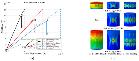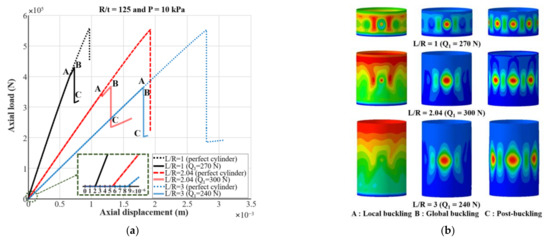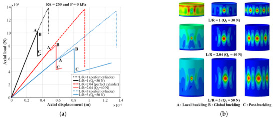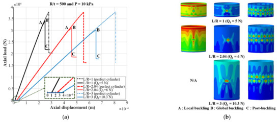 The nonlinear post-buckling analysis results for the cylinders with R/t = 250 are presented in Figure 7. As shown in Figure 7a, the (Ncr)perfect values with L/R = 1, 2.04, and 3 are predicted to be 139.09, 136.76, and 133.54 kN, respectively. These loads with L/R = 2.04 and 3 are lower by 1.68% and 3.99%, respectively, compared with the value for L/R = 1. Meanwhile, the (Ncr)imperfect values are 99.81, 81.37, and 75.81 kN for the cylinders with L/R = 1, 2.04, and 3, respectively. The global buckling loads for L/R = 2.04 and 3 are lower than the value for L/R = 1 by 18.48% and 24.05%, respectively. The local buckling (A), global buckling (B), and post-buckling (C) shapes are shown in Figure 7b. The deformed configurations at local buckling (A) and global buckling (B) are similar to the previously reported results (Figure 6b).